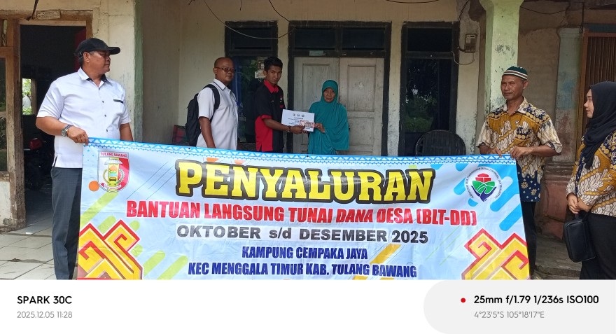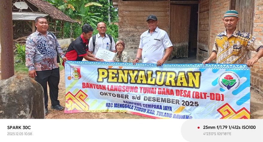 Tanggal 05 Desember 2025 Pemerintah Kampung Cempaka Jaya hari ini sukses menyalurkan Bantuan Langsung Tunai yang bersumber dari Dana Desa (BLT DD) untuk triwulan IV, yang mencakup periode Oktober, November, dan Desember tahun anggaran 2025. Penyaluran ini sekaligus menjadi penutup seluruh rangkaian distribusi BLT DD di tahun 2025. Keluarga Penerima Manfaat (KPM). Proses penyaluran berjalan lancar, tertib, dan kondusif.